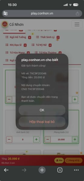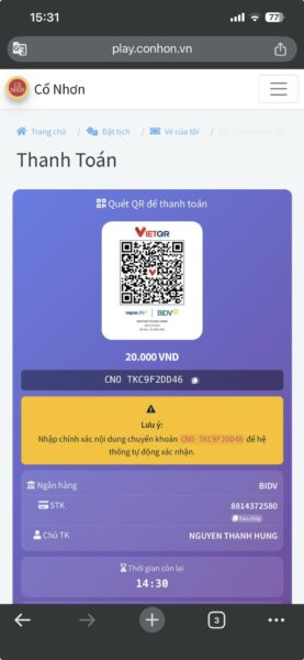 Nếu đã chắc chắc với lựa chọn hãy bấm vào đặt tịch, trang sẽ chuyển sang trang thanh toán như sau. Bạn có thể thực hiện chuyển khoản với các thông tin như sau hoặc thực hiện quét mã QR