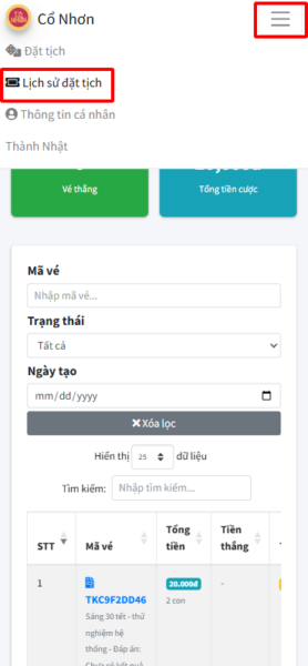 Xem lịch sử đã đặt
